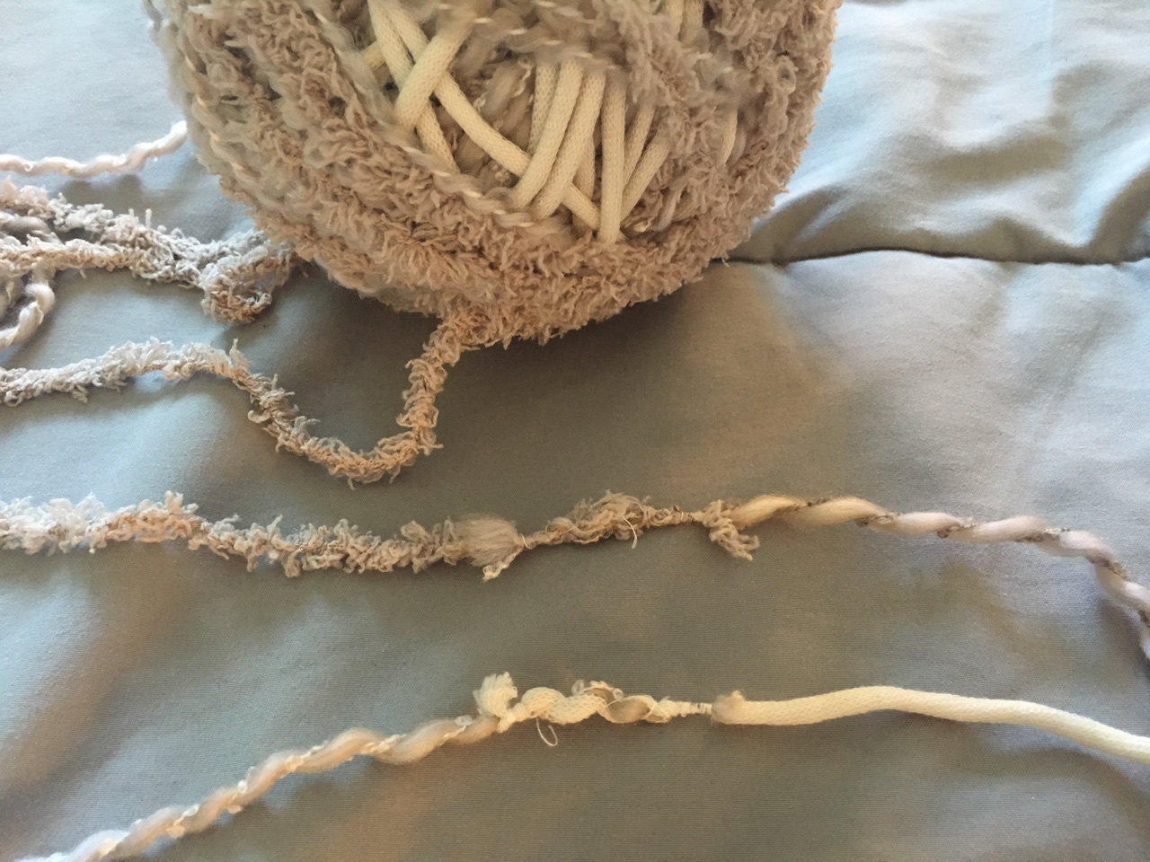 A curious yarn puzzle that came in one of the grab bags purchased at our local thrift store, a menagerie of what appeared to be very different fibers, even if complimentary colors, and one can only wonder about the intentions of the crafter responsible for this. Slowly and methodically working it all apart, I found that they had been consecutively joined, fuzzy grey to lumpy lavendar, lumpy lavendar to silky white nylon. I balled it and rejoined it to the stash.